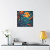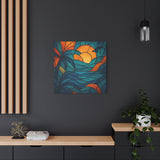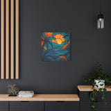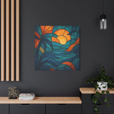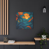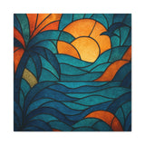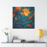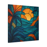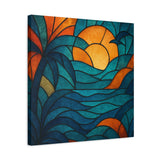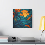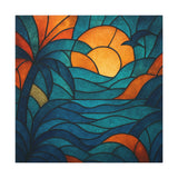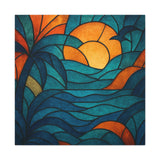 Warm light and rolling teal waves meet in this stretched matte canvas, evoking evenings where the horizon glows and the sea breathes slow. The rich, stained-glass–like palette—deep sea blues, teal swells, and sunset ambers—brings a calm, contemplative energy to a room. Mounted on a slim 1.25" pine profile, the print sits close to the wall and reads as a crafted art piece rather than a poster. Small rubber dots on the back protect surfaces and keep the canvas steady when hung. Choose vertical, horizontal, or square orientations and from many sizes to fit a cozy reading nook, a sunlit hallway, or a seaside-inspired gallery wall. This piece suits someone who collects color, texture, and moments that feel like quiet evenings by the water.
